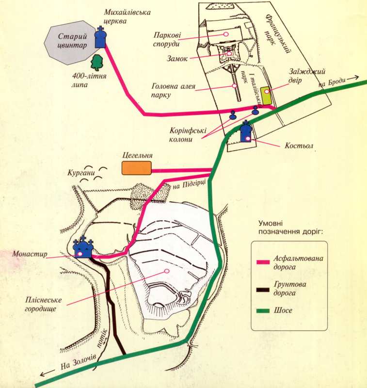 Схематичний план пам’ятокРозмір зображення: 757:800 піксел Джерело: Чобіт Д. Підгірці: історико-архітектурна перлина України.- Броди: Просвіта, 1998 р. |