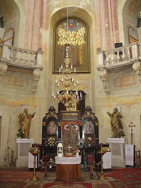 2007 р. Інтер’єр з видом на вівтар Розмір зображення: 600:800 піксел Фото Зенона Боровця, 25 травня 2007 р. Вкладені елементи Вівтарна ніша (+) Скульптура ліворуч Скульптура праворуч Іконостас (+) Іконостас (2) (+) 2014 р. Ікона у вівтарній ніші