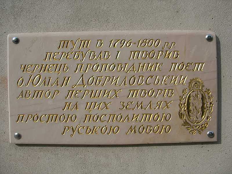 Напис: «Тут в 1796 – 1800 рр. перебував і творив чернець, проповідник, поет о. Юліан Добриловський, автор перших творів на цих землях простою посполитою руською мовою».