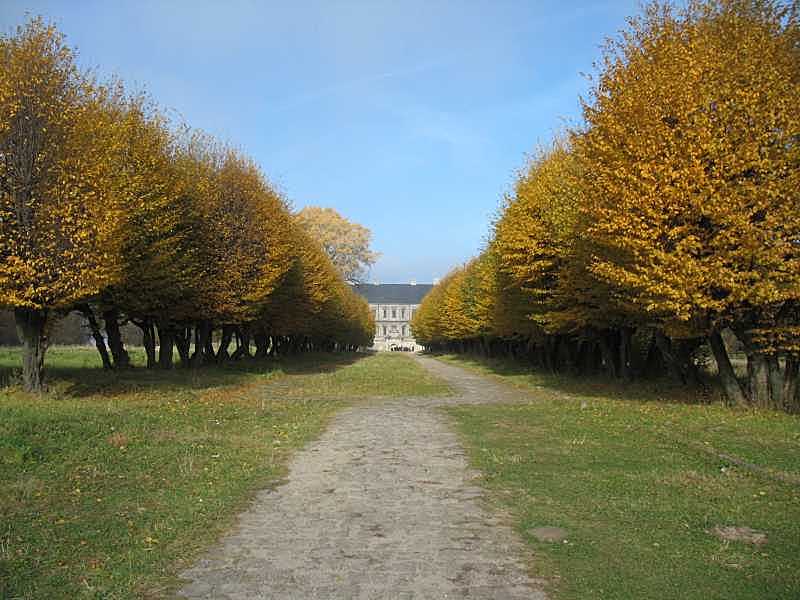 Вигляд з півдня. Алея веде від костелу до головної брами. Фото Зенона Боровця, 26 жовтня 2006 р.