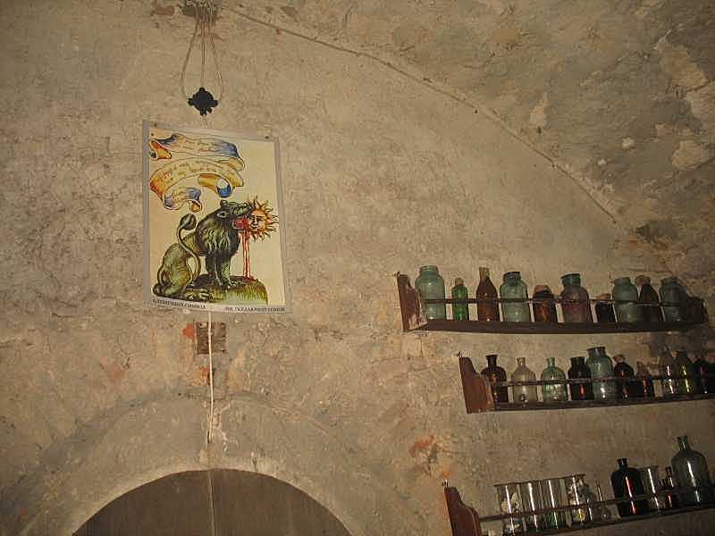 Емблема і полиці з посудом Розмір зображення: 800:600 піксел Фото Зенона Боровця, 23 травня 2012 р. Попередня сторінка | Вище | Наступна сторінка