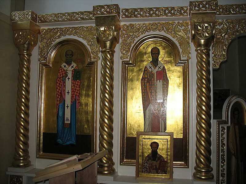 Ліва частина іконостасаРозмір зображення: 800:600 піксел Ікони св. Іоана Богослова (ліворуч) та св. Василя Великого (праворус). Фото Зенона Боровця і Богдана Тхора, 27 квітня 2007 р. |