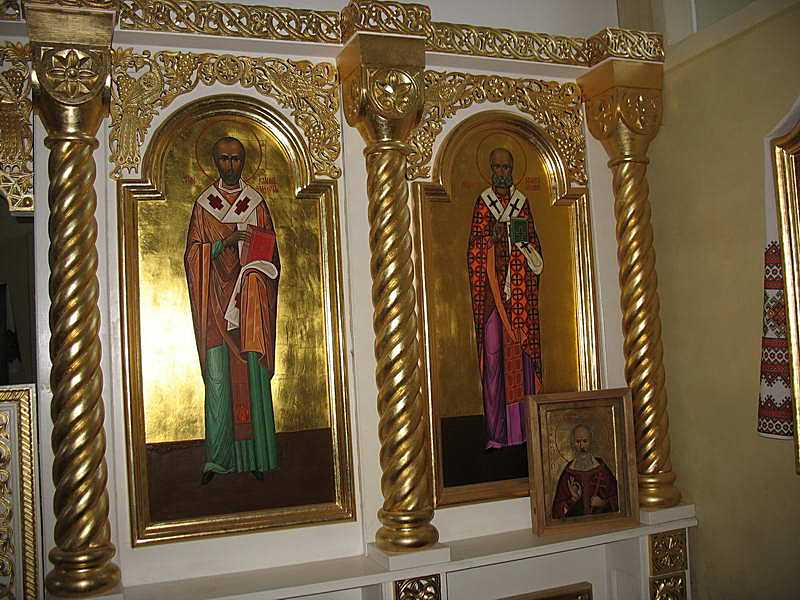 Ікони св. Іоана Золотоуста (ліворуч) та св. Афанасія Великого (праворуч). Фото Зенона Боровця і Богдана Тхора, 27 квітня 2007 р.