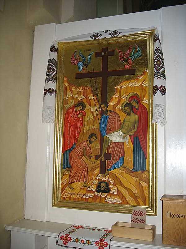 2007 р. Ікона «Зняття з хреста»Розмір зображення: 600:800 піксел У північній наві, перед іконостасом. Фото Зенона Боровця і Богдана Тхора, 27 квітня 2007 р. |