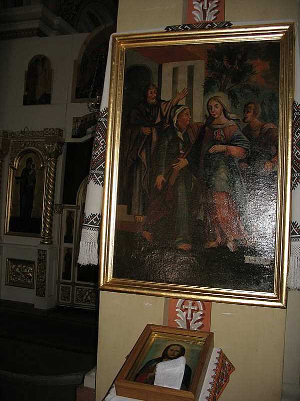 Ікона «Зустріч Марії та Єлизавети»Розмір зображення: 600:800 піксел На західному боці південно-східного стовпа. Фото Зенона Боровця і Богдана Тхора, 27 квітня 2007 р. |
