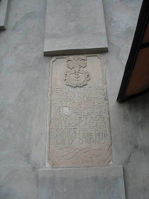 На плиті напис: «Per illustris magnificus dominus Andreas Wylezinsky pocillator Wolhyniae e[t] fundamentis ist ius chori lapidem angularem repletum sagris peliqui is posult propriis manibus die 14 Julii 1760 anno.»