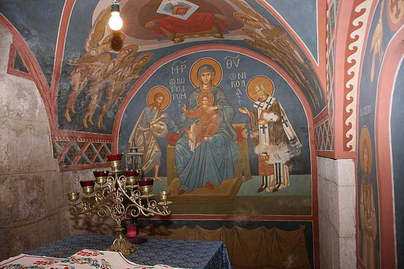 Богородоця Провідниця з пристоячимиРозмір зображення: 800:533 піксел Ліворуч – Іоан Хреститель, праворуч – св. Миколай. Фото Зенона Боровця і Богдана Тхора, 10 серпня 2011 р. |