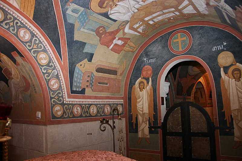 Вигляд з північого сходуРозмір зображення: 800:533 піксел На склепіння фрагмент «Гостинності Авраама», праворуч – царські врата. Фото Зенона Боровця і Богдана Тхора, 10 серпня 2011 р. |