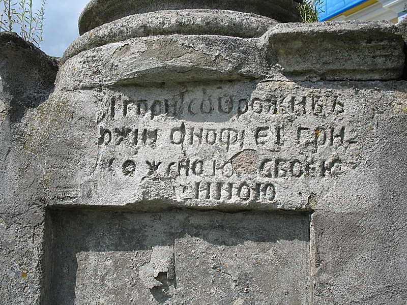 Пошкоджений напис під скульптурою св. ФнуфріяРозмір зображення: 800:600 піксел Фото Зенона Боровця і Богдана Тхора, 10 серпня 2011 р. |