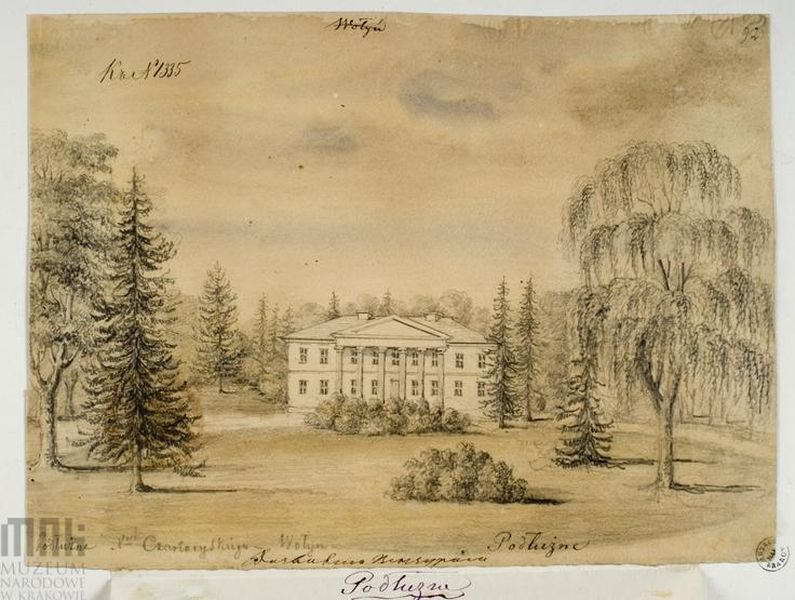 Pałac Czartoryskich dawniej Radziwiłłów. Widok od strony podjazdu. Pałac dwukondygnacjowy z portykiem kolumnowym w wielkim porządku. 1862 – 1876. Napis: Podłużne Xcia Czartoryskiego – Wołyń; Podłużne; napis na podkładzie: Wołyń. Podłużne, – pałac; napis na kartce doklejonej do podkładu: Podłużne. Posiadłość Xiężny Marceliny Czartoryskiej z domu Xny Radziwiłównej – Ogród nad rzeką Horyń; ostatni napis powtórzony w języku francuskim. Ryś. ołówkiem podmalowany sepią, 19,5x26,5. III-r.a. 4232 (Teka Wołyń). Bibl.: Jaroszewski, Rottermund, Wiadomości o życiu i twórczości, ii. 30. [Katalog rysunków architektonicznych ze zbiorów Muzeum narodowego w Krakowie. 1. Rysunki Napoleona Ordy / Opracowały Zofia Kucielska i Zofia Tobiaszowa. – Warszawa: Państwowe wydawnictwo naukowe, 1975, Nr. 552]