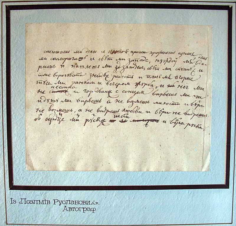 Автограф «Псалмів Русланових»Розмір зображення: 800:766 піксел Фото Зенона Боровця і Богдана Тхора, 27 жовтня 2007 р. Фрагмент . |