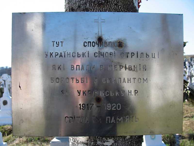 Табличка з написомРозмір зображення: 800:600 піксел Фото Зенона Боровця, 30 березня 2007 р. Напис: «Тут спочивають січові стрільці, які впали у нерівній боротьбі з окупантом за Украінську Н[ародну] Р[еспубліку]. 1917 – 1920. Світла їм пам’ять». |