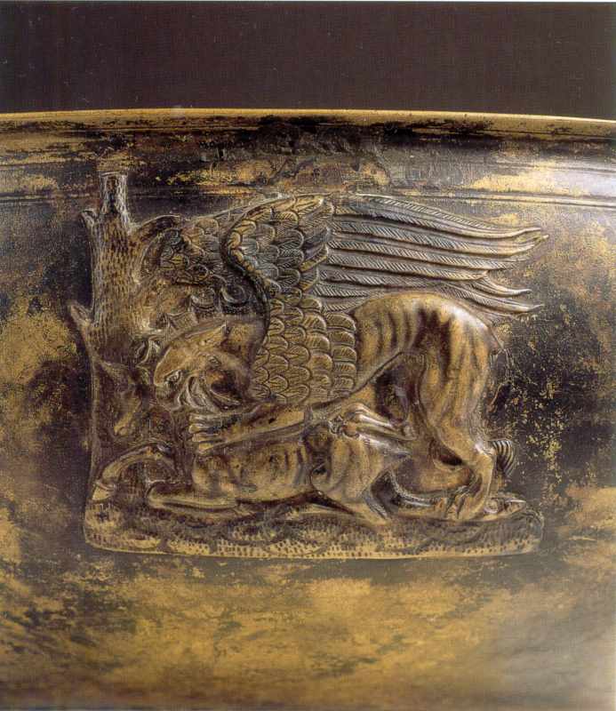 Грифон терзає оленяРозмір зображення: 693:800 піксел Джерело: Gold der Steppe: Archaeologie der Ukraine. – Schleswig: 1991, S. 381. |