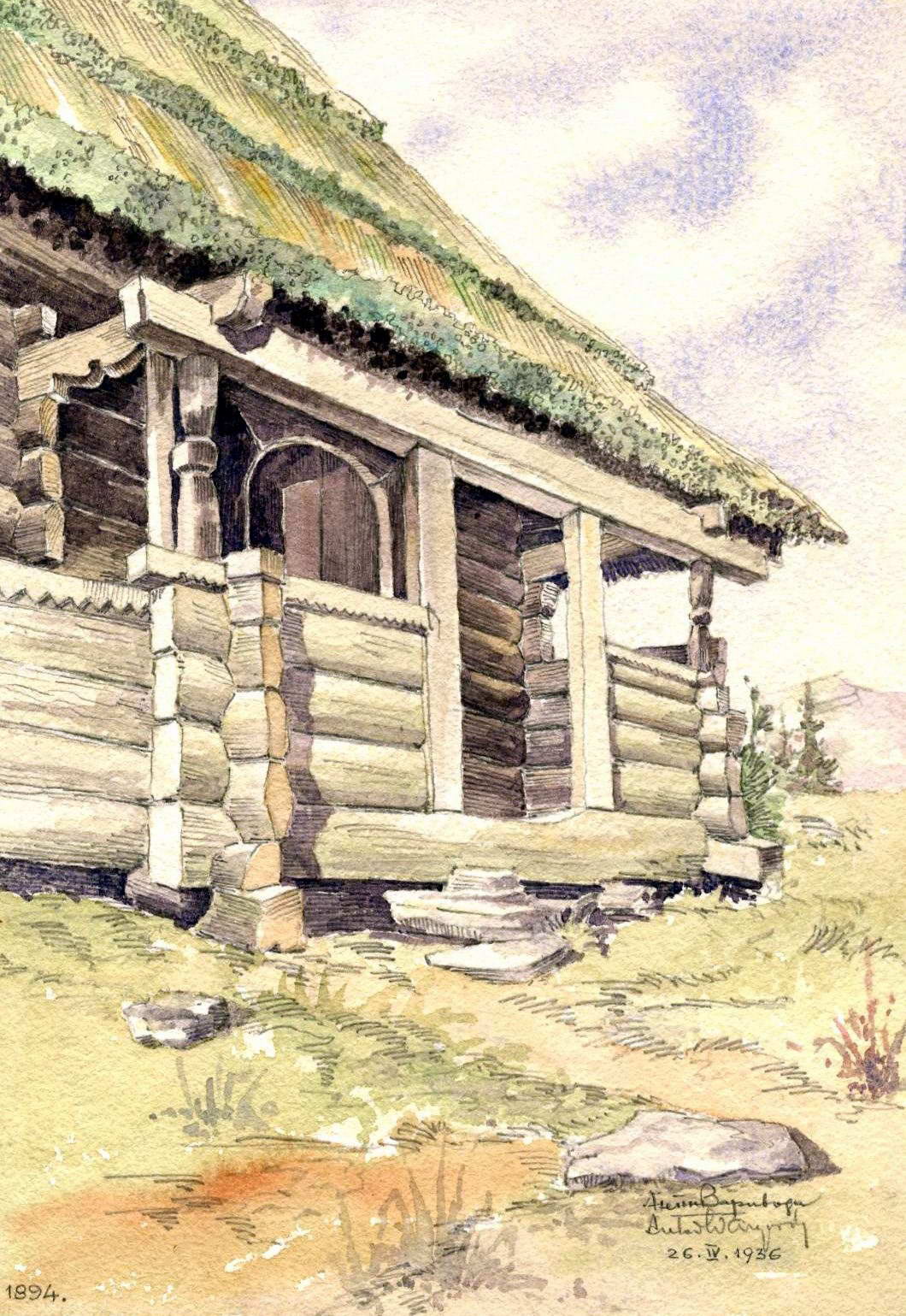 1894 Dwelling, Plavye (Plawie). Southern view of the main entrance showing construction of the front porch and its connection to the thatched roof.