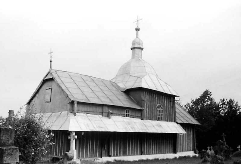 Дерев.церква: орієнтація вівтаря 78° на горбі над околицею села, на цвинтарі; дерев. дзвіниця в позиції А4. Спостереження М.І.Жарких, 20 серпня 1991 р.