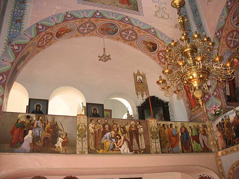 Балюстрада хорів з іконами «В’їзд до Єрусалиму», «Омовення ніг», «Причастя апостолів». Праворуч – фрагмент ікони «Несіння хреста» на східній стіні. Фото Зенона Боровця, 27 квітня 2007 р.