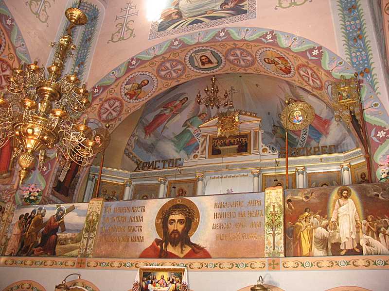 Фрагмент східної стіниРозмір зображення: 800:600 піксел На рівні хорів – ікони «Несіння хреста», «Христос у терновомі вінці», «Воскресіння». Вище видно запрестольну ікону «Таємна вечера». Фото Зенона Боровця, 27 квітня 2007 р. |