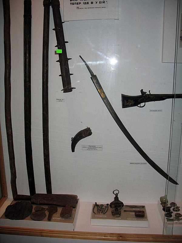 Бойовий ціп (муляж), нижче – порохівниця, знайдена у с. Ситниця Маневицького району Волинської обл., далі направо – шабля польського шляхтича, литовський пістоль. Внизу ліворуч – вироби з дерева, в центрі – вироби із заліза (цвяхи, замок). Фото Зенона Боровця, 6 липня 2007 р.