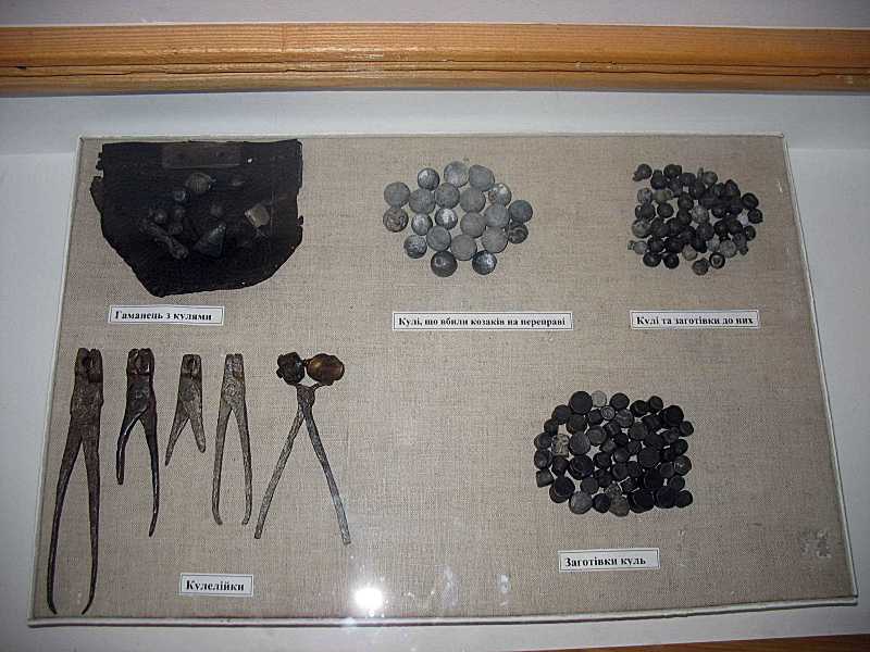 Верхній ряд, від лівого краю: гаманець із кулями; кулі, якими вўито козаків на переправі; кулі та заготівки до них; нижній ряд: кулелійки; заготівки куль. Фото Зенона Боровця, 6 липня 2007 р.