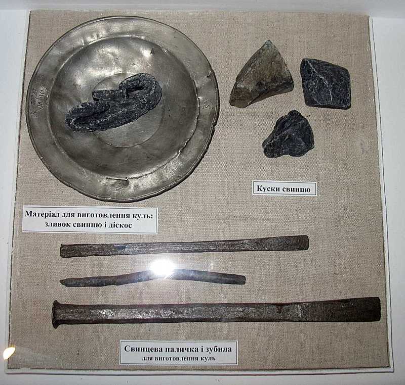 Матеріали для кульРозмір зображення: 800:762 піксел Вгорі – свинцевий дискос, в ньому – зливок свинцю; направо – куски свинцю; внизу – два зубила для виготовлення куль, між ними – свинцева паличка. Фото Зенона Боровця, 6 липня 2007 р. |