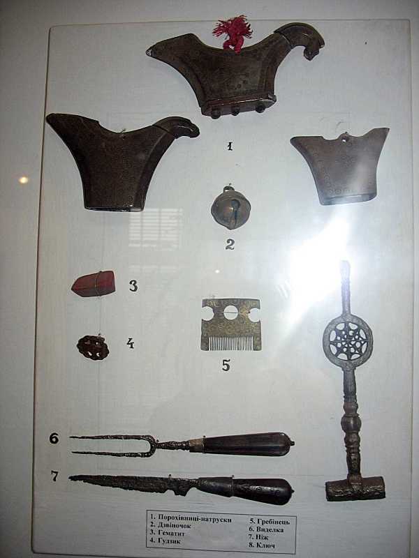 Начиння (3)Розмір зображення: 600:800 піксел 1 – порохівниці-натруски; 2 – дзвночок; 3 – шматок гематиту; 4 – гудзик; 5 – гребінець; 6 – виделка; 7 – ніж; 8 – ключ. Фото Зенона Боровця, 6 липня 2007 р. |