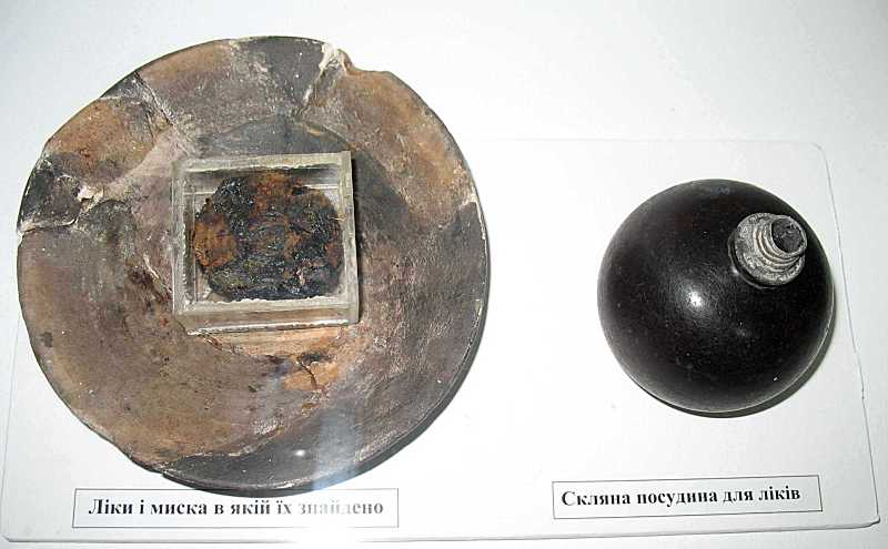 Лікарське начинняРозмір зображення: 800:495 піксел Ліворуч – ліки та миска, в якій їх знайдено; праворуч – скляна посудина для ліків. Фото Зенона Боровця, 6 липня 2007 р. |