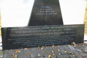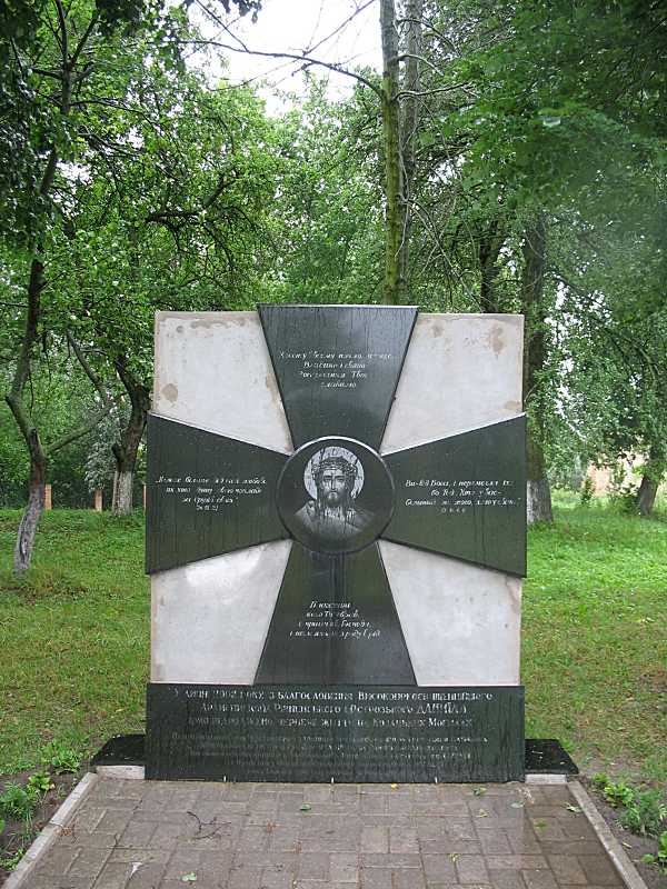 На цоколі напис: «У липні 2002 року з благословення високопреосвященнійшого архієпископа Рвненського і Острозького Даниїла, було відроджено чернече життя на Козацьких Могилах. Цей пам’ятний знак поставлено старанням братії монастиря за святійшого патріарха Київського і всієї Русі-України Філарета, за священноархімандрита високопреосвященнійшого митрополита Рівненського і Острозького Євсевія, за намісника – високопреподобного архімандрита Олексія року божого 2007-го місяця червня дня 10-го».