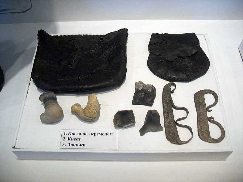 Побутові речіРозмір зображення: 800:600 піксел Вгорі – два кисети, внизу ліворуч – дві люльки, праворуч – кремені та кресала. Фото Зенона Боровця, 23 липня 2008 р. |