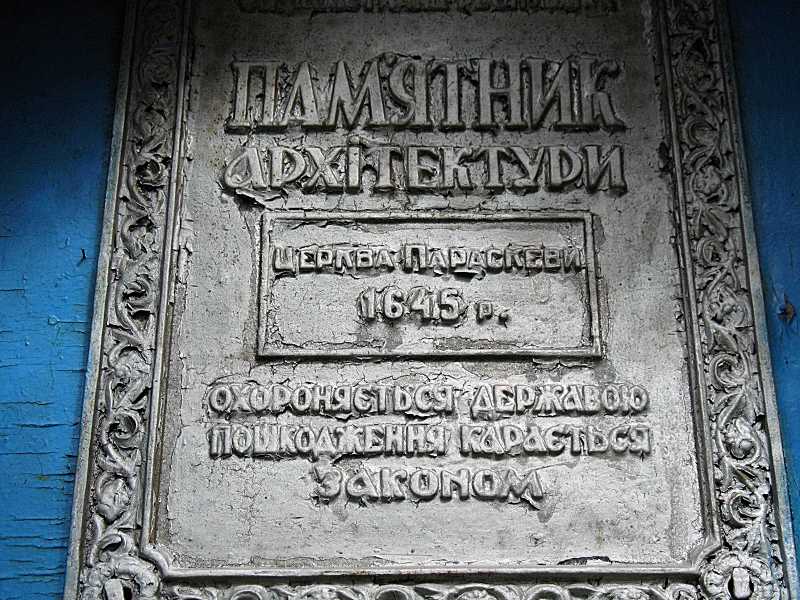 Охоронна дошка пам’яткиРозмір зображення: 800:600 піксел Фото Зенона Боровця, 5 вересня 2006 р. Напис: «Церква Параскеви 1645 р.» |