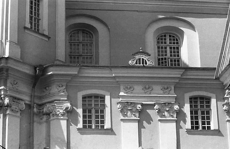 Фрагмент східного фасадуРозмір зображення: 800:521 піксел 1988 р. 19 серпня. Фото М.І.Жарких. Негатека, № 479-26. |