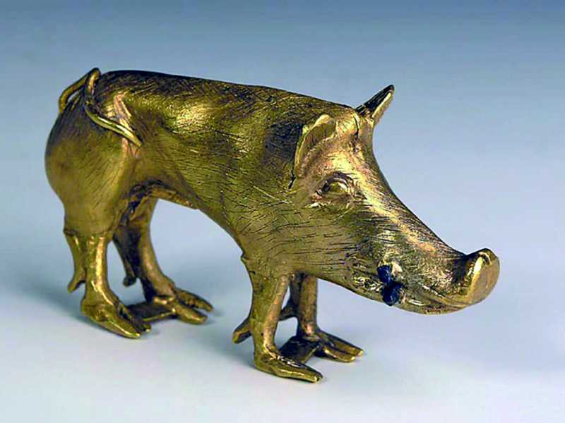 Ручка дерев’яної посудини у вигляді золотої скульптури вепра з кургану Хомина Могила