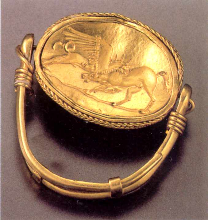 Загальний вигляд (зворотній бік)Розмір зображення: 678:716 піксел Перстенева печатка. Зворотній бік із зображенням грифона, який терзає коня Джерело: Scythian gold: Museum of historic treasures of Ukraine. – S.l.: 1992, p. 86. |