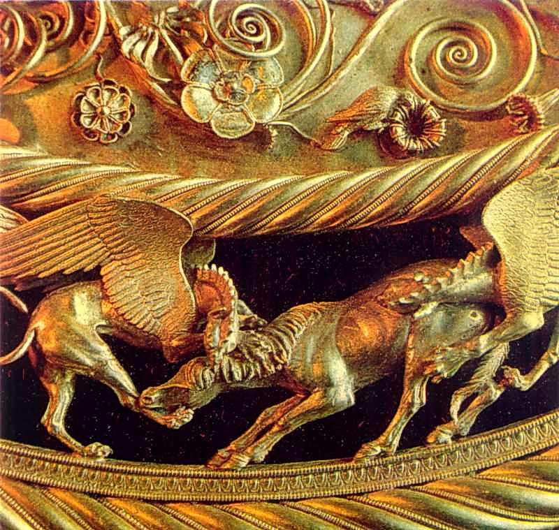 Грифони і кінь (43 - 45)Розмір зображення: 800:759 піксел Джерело: Античне мистецтво. – К.: Мистецтво, 1977 р., № 166. |