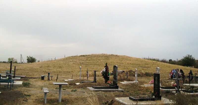 Курган (h=6 м, d=80 м), Покровське, центр селища; на кладовищі.