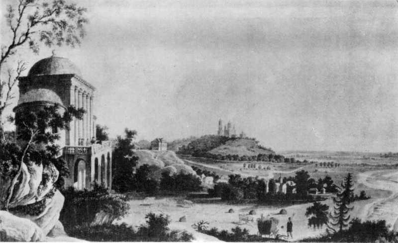Вид Хрестовоздвиженського монастиря в Полтаві біля річки Ворскли. Гравюра на металі Т.Стадлера з акварелі О. Кунавіна. Початок XIX ст.