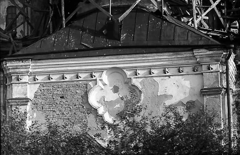 Фрагмент центральної частини південного фасадуРозмір зображення: 800:517 піксел 1983 р. 24 травня. Фото М.І.Жарких. Негатека, № 202-17. |