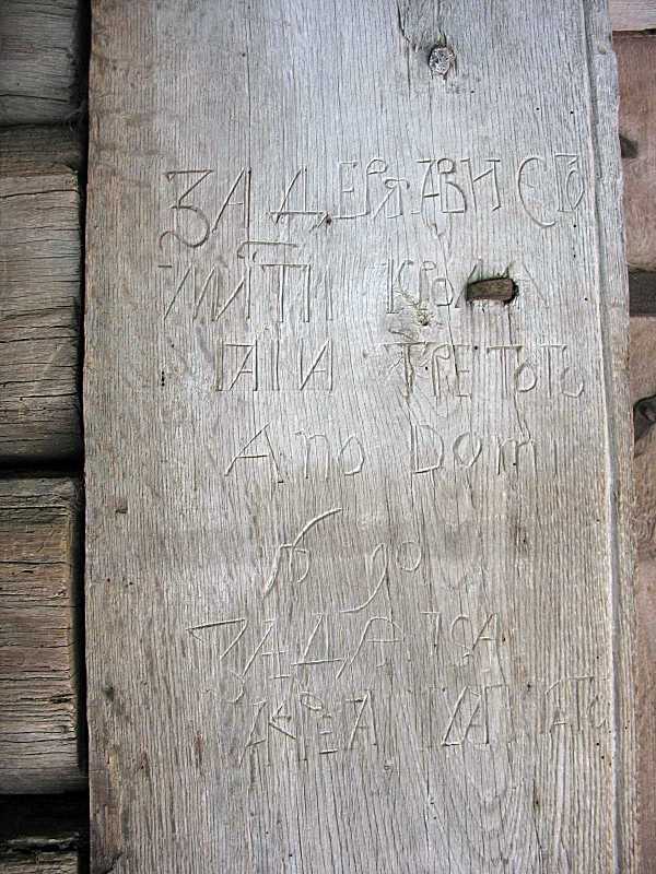 Лівий одвірок входу з написомРозмір зображення: 600:800 піксел Фото Зенона Боровця і Богдана Тхора, 5 вересня 2006 р. |