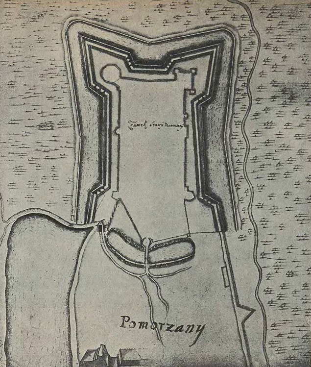 План Поморянского замка 17 века. Помимо замка также видим часть вала городских укреплений. Источник: «Zarys historii budownictwa obronnego i wojskowego w dawnej Polsce (od VII do początku XIX wieku)» (1936).