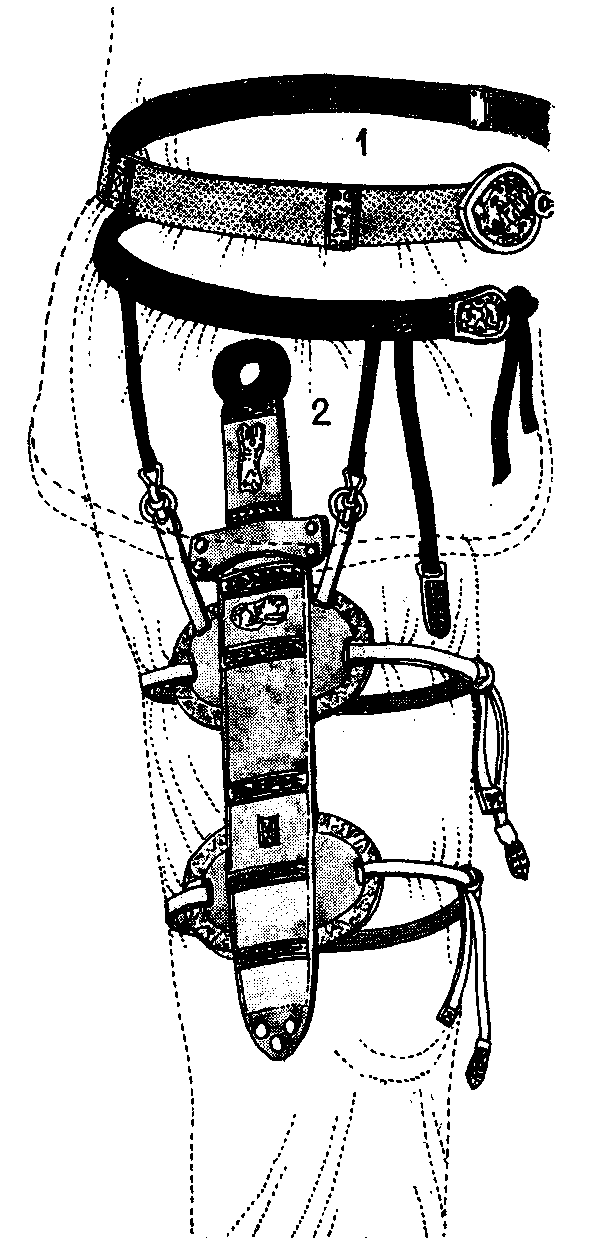 Гарнітури пояса і портупеї меча сарматського князя із Порогів. Реконструкція О.В.СимоненкаРозмір зображення: 605:1256 піксел Джерело: Gold der Steppe: Archaeologie der Ukraine. – Schleswig: 1991, S. 215. |
