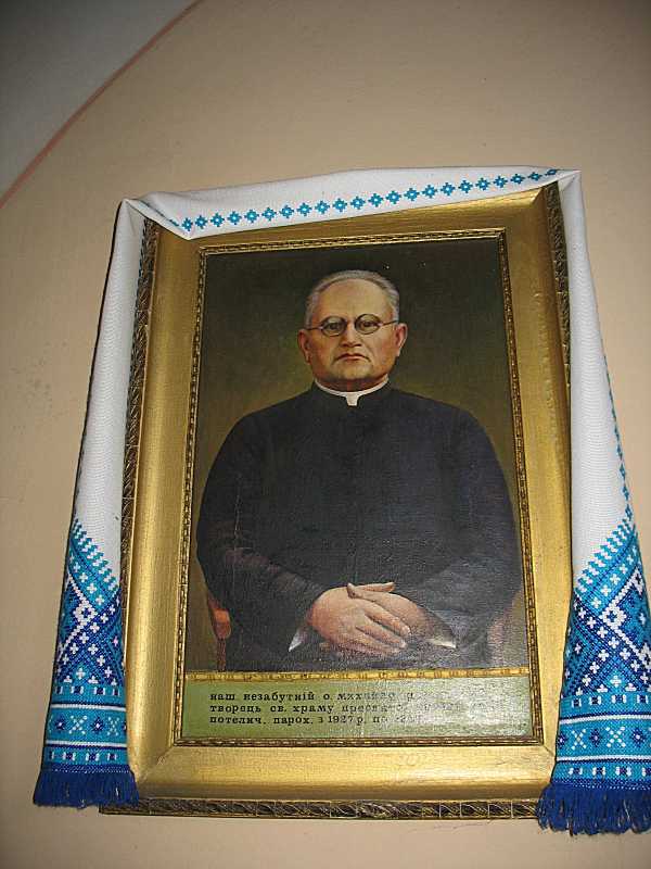 Напис: «Наш незабутній о. Михайло Дороцький, творець св. храму пресвятої Тройці в селі Потелич, парох з 1927 до 1953 р.».