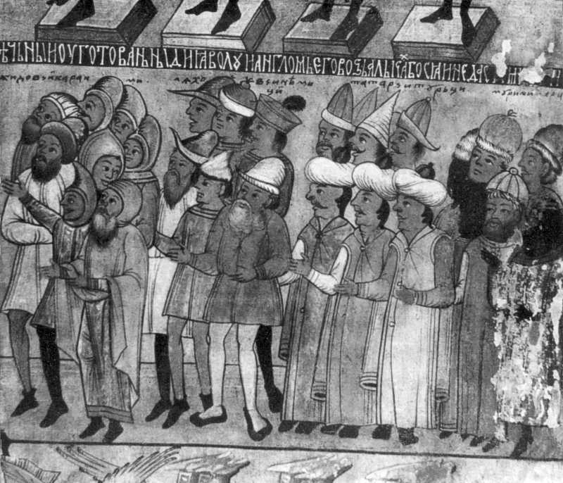 Страшний суд. Фрагмент ікони із с. Станиль. Кін. XVI ст.Людмила Міляєва Розмір зображення: 800:686 піксел Джерело: Міляєва Л.С. Стінопис Потелича. – К.: Наукова думка, 1969 р., с. 43. |