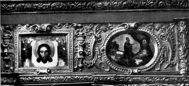 Фрагмент іконостаса Успенської церкви с. Великі Грибовичі. 1638.Людмила Міляєва Розмір зображення: 800:366 піксел Джерело: Міляєва Л.С. Стінопис Потелича. – К.: Наукова думка, 1969 р., с. 45. |