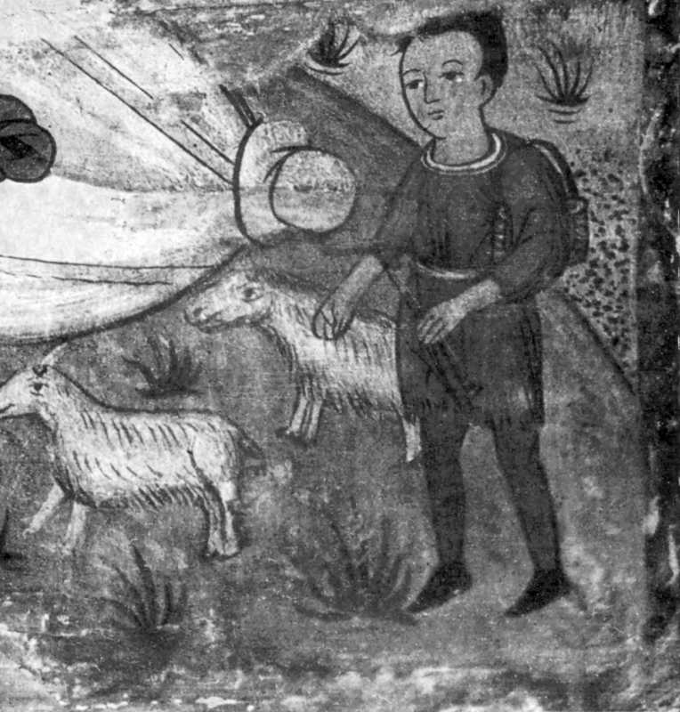 Вівці і пастухЛюдмила Міляєва Розмір зображення: 764:800 піксел Джерело: Міляєва Л.С. Стінопис Потелича. – К.: Наукова думка, 1969 р., с. 119. |