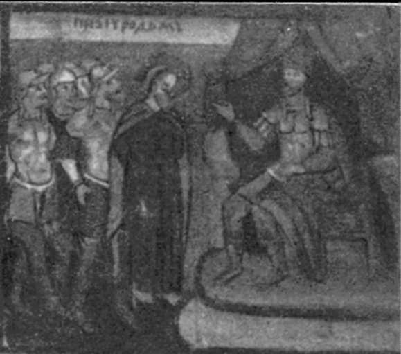 Христос перед ПілатомЛюдмила Міляєва Розмір зображення: 579:511 піксел Джерело: Міляєва Л.С. Стінопис Потелича. – К.: Наукова думка, 1969 р., с. 133. |