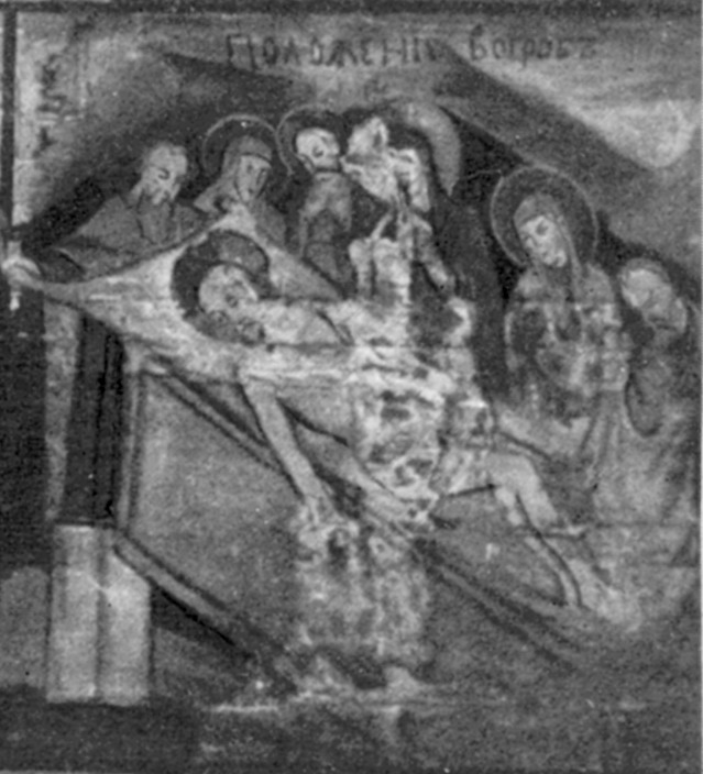 Покладання до труниЛюдмила Міляєва Розмір зображення: 639:704 піксел Джерело: Міляєва Л.С. Стінопис Потелича. – К.: Наукова думка, 1969 р., с. 133. |