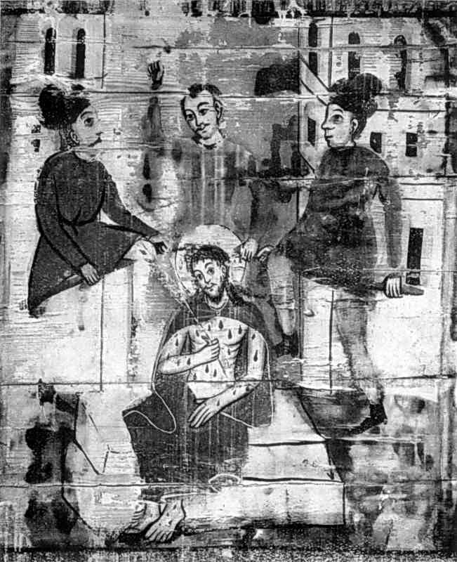 Центральна частинаРозмір зображення: 651:800 піксел Христос у багряниці. Деталь розпису церкви св. Духа в Потеличі. 1620 р. Джерело: Історія українського мистецтва. – К.: Наукова думка, 1967 р., т. 2, с. 191. |