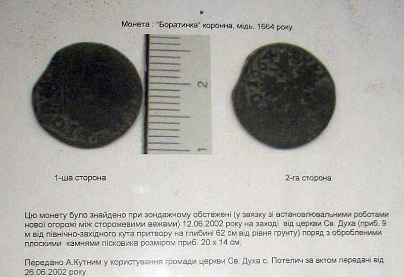 Напис: «Цю монету було знайдено при зондажному обстеженні (у зв’язку зі встановленням нової огорожі між сторожовими вежами) 12.06.2002 року на заході від церкви св. духа (приблизно в 9 м від північно-західного кута притвору на глибині 62 см від рівня грунту) поряд з обробленими плоскими каменями піскович розміром приблизно 20:14 см. Передано А. Кутним у користування громаді св. духа с. Потелич за актом передачі 26.06.2002 р.».