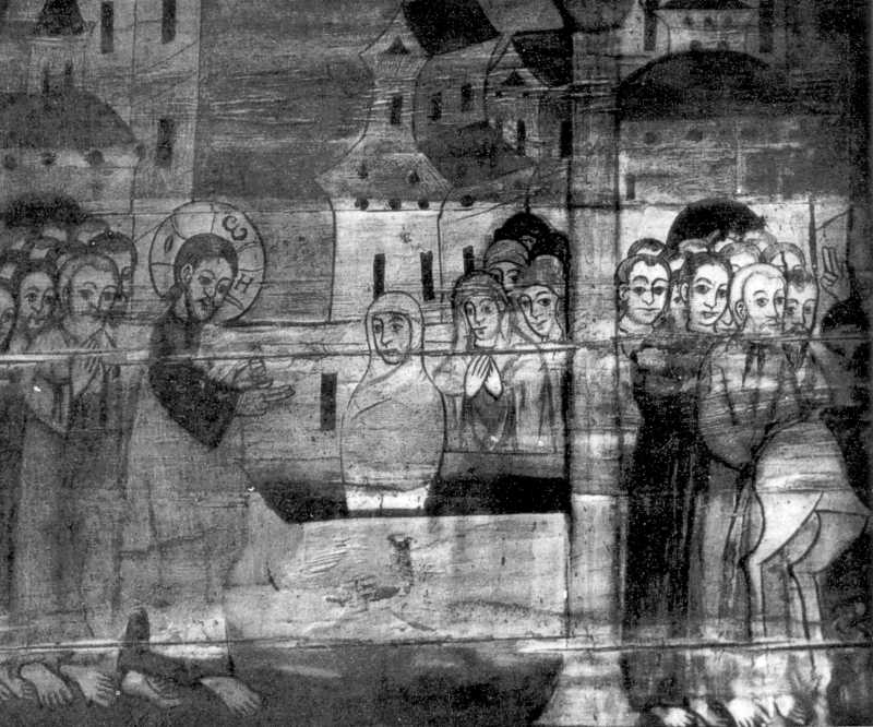 Юрба вирішена дуже традиційно – над двома зображеними на весь зріст першоплаковими постатями драбинкою йдуть голови й тім’я голів. Відчуття трьохвимірного простору і легкості зберігається в сцені тільки завдяки лініям архітектури, що йдуть в глибину, та контрасту сліпучо-білих будівель з блакитним тлом між ними. Велика кількість білого відіграє неабияку роль в сюжеті, в якому немає драматичної напруженості. Майстер не розв’язував сцену психологічно. Очі всіх дійових осіб відведені вбік. Навіть винуватець дива, Христос, ніби заглибився у свої думи. Художник дуже просто малює обличчя, в нього є свій особливий прийом: не мудруючи, прорисовує ледь здивовані підняті брови, м’ясистий ніс, широко розплющені очі і розтулені губи, зберігаючи в абрисі ликів вираз щирості і доброти. Чорна лінія в його манері відіграє першорядну роль. Це скоріше графічний, ніж живописний малюнок, але без будь-якої сухості.