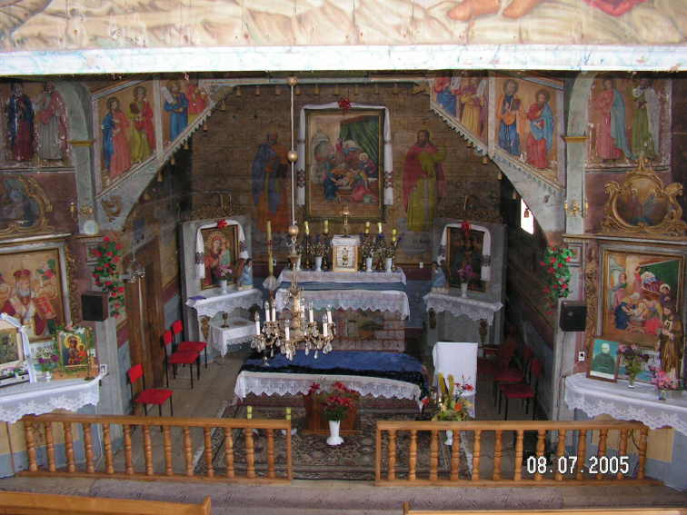 Drewniana kaplica w Prusiu. Prezbiterium kaplicy widziane z chóru.