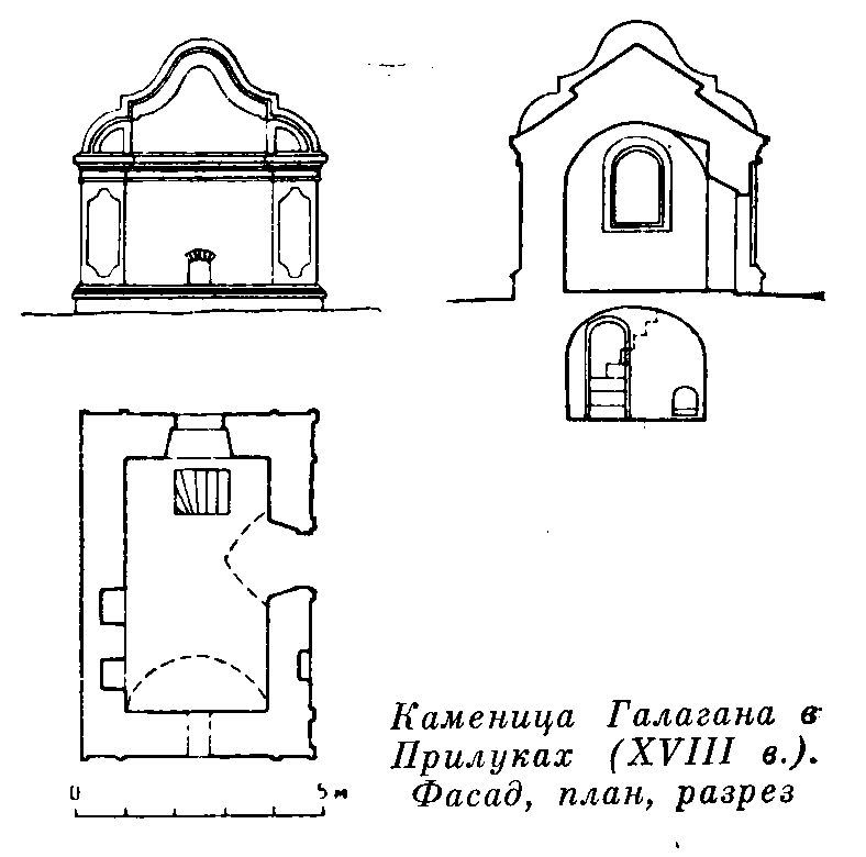 Фасад, план, перерізРозмір зображення: 788:780 піксел Каменица Галагана в г. Прилуках, нач. XVIII в. План, разрез, фасад (обмеры автора) (стр. 99) |